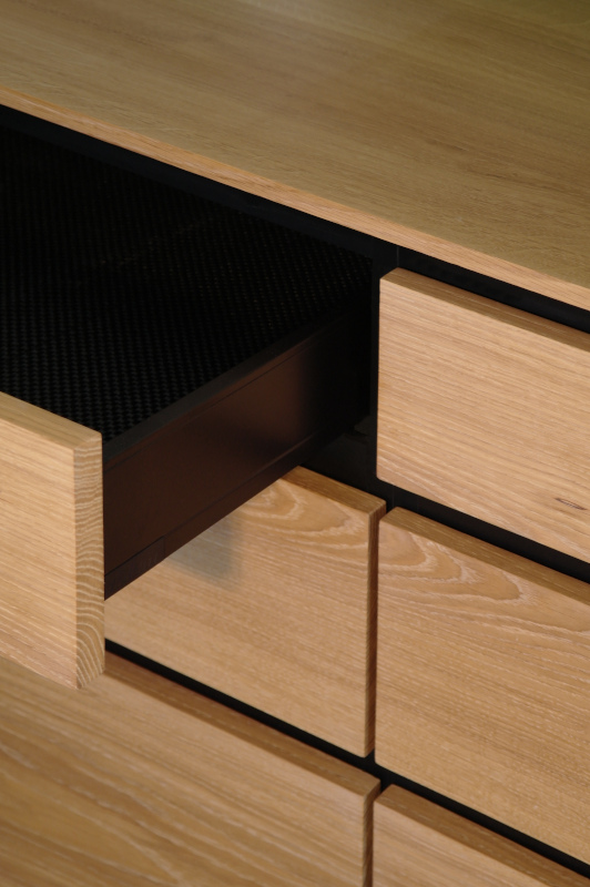 Pour ne pas avoir à mettre de poignées et ainsi garder un aspect minimaliste des façades, les propriétaires ont fait le choix de coulisses de tiroir Touche-lâche de chez un grand fabriquant, la marque BLUM. L’ouverture du tiroir se fait par une simple pression sur la façade. A la fermeture, tout se fait en douceur grâce à un amortisseur intégré dans la coulisse. Pratique quand on a les mains dans le pétrin.